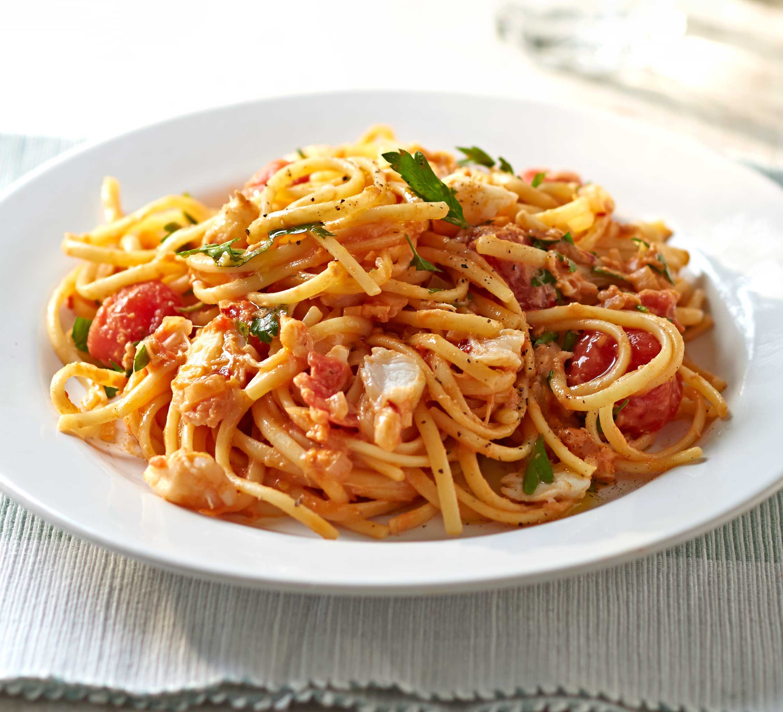 Linguini tossed with blue swimmer crab, chilli, garlic, roasted tomato sugo, baby spinach. Large (6)